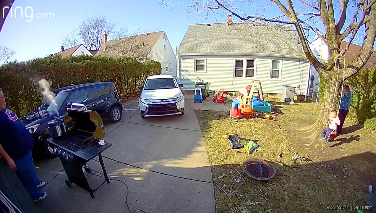 A man pushes a young boy on a swing in a yard and the young boy slips and falls off and crashes into playground equipment. Security footage.
