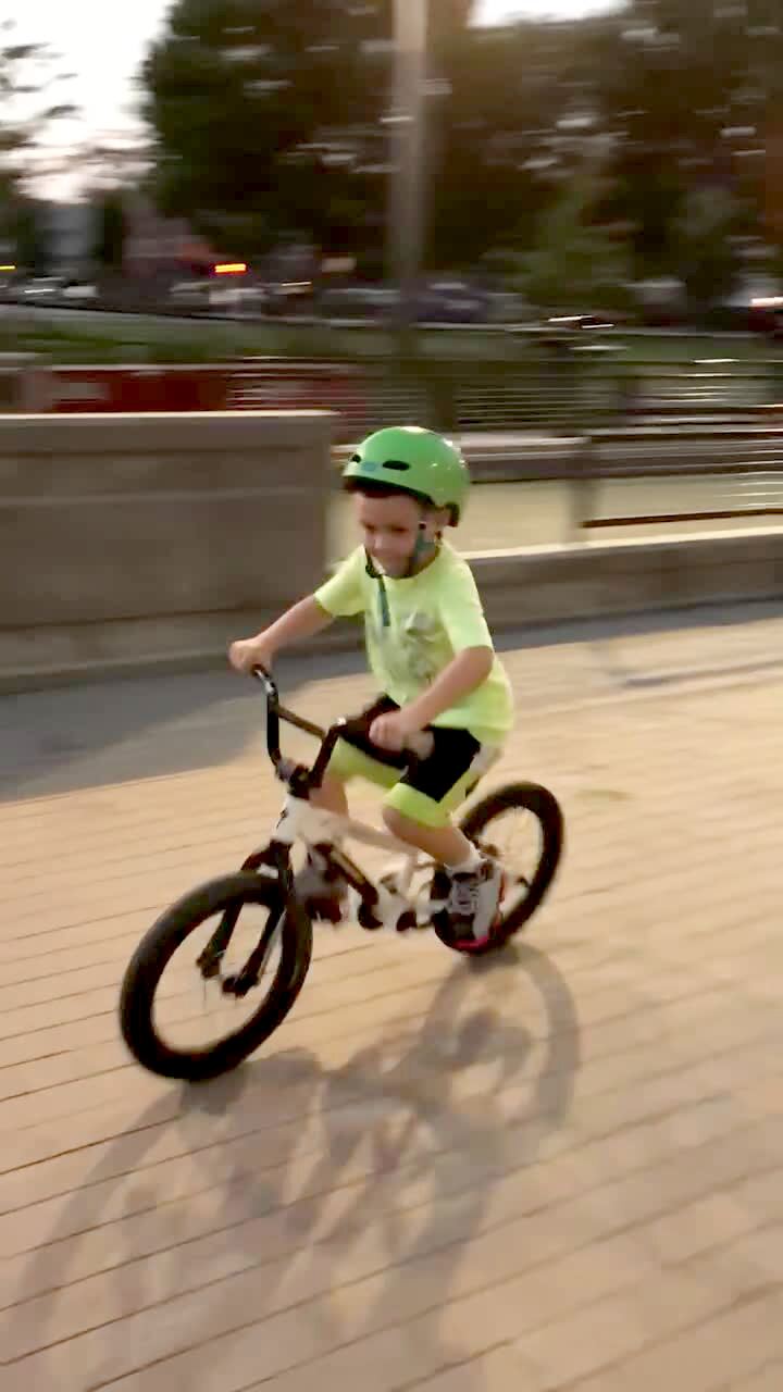 A young boy rides a bicycle and a girl follows, talking to the camera when the the boy hits a metal pole.