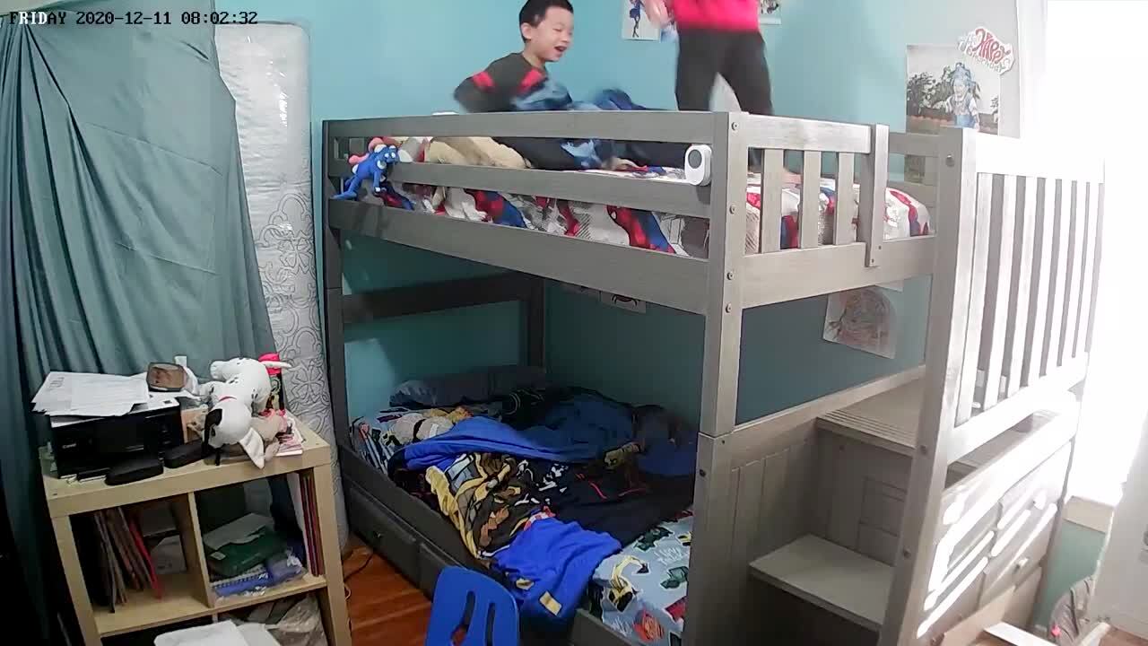 Two young boys jump on a top bunk when the bed breaks and falls onto the bottom bunk. Security footage. Music rights not cleared.