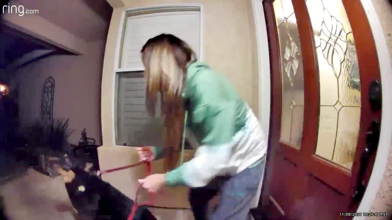A woman tells a German shepherd dog to sit on a porch before they go for a walk, but the dog runs and pulls the woman with him. Security footage.