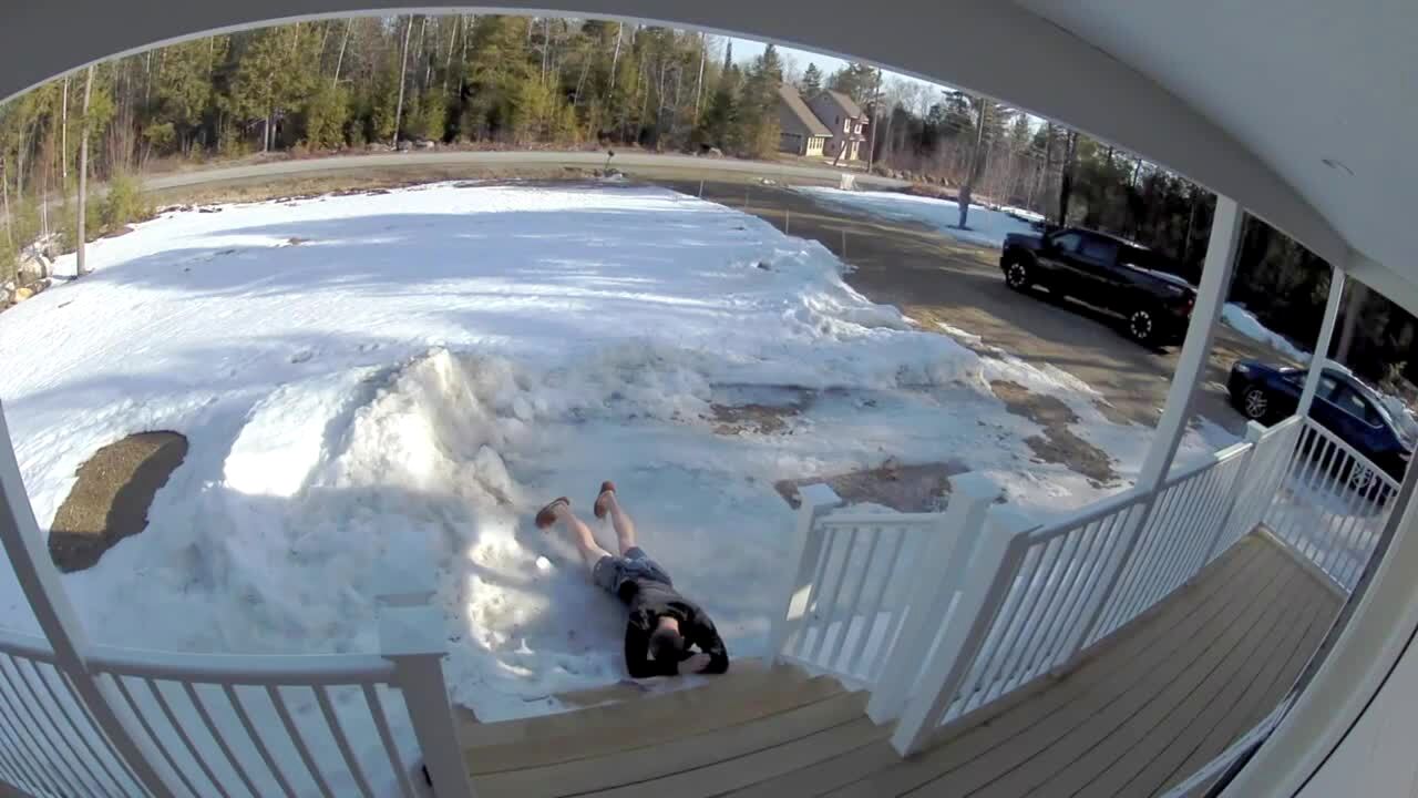 A man slips on icy porch steps and falls hard on the snow in a yard. Security footage.