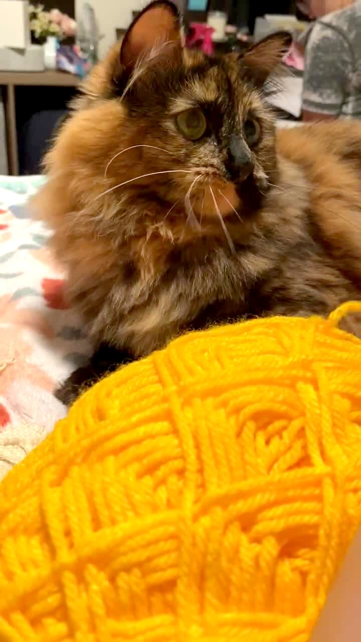 A cat plays with a ball of wool on a bed in a bedroom and it rolls and slips and falls off the bed.