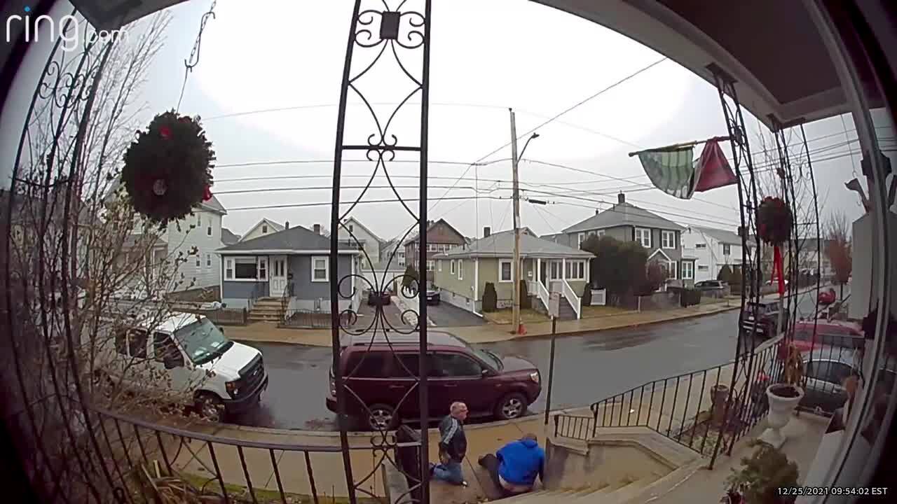 A man slips and falls down a porch staircase, then his son slips and falls after him. Security footage. Featured talent cleared only (the two men who fall down the stairs).