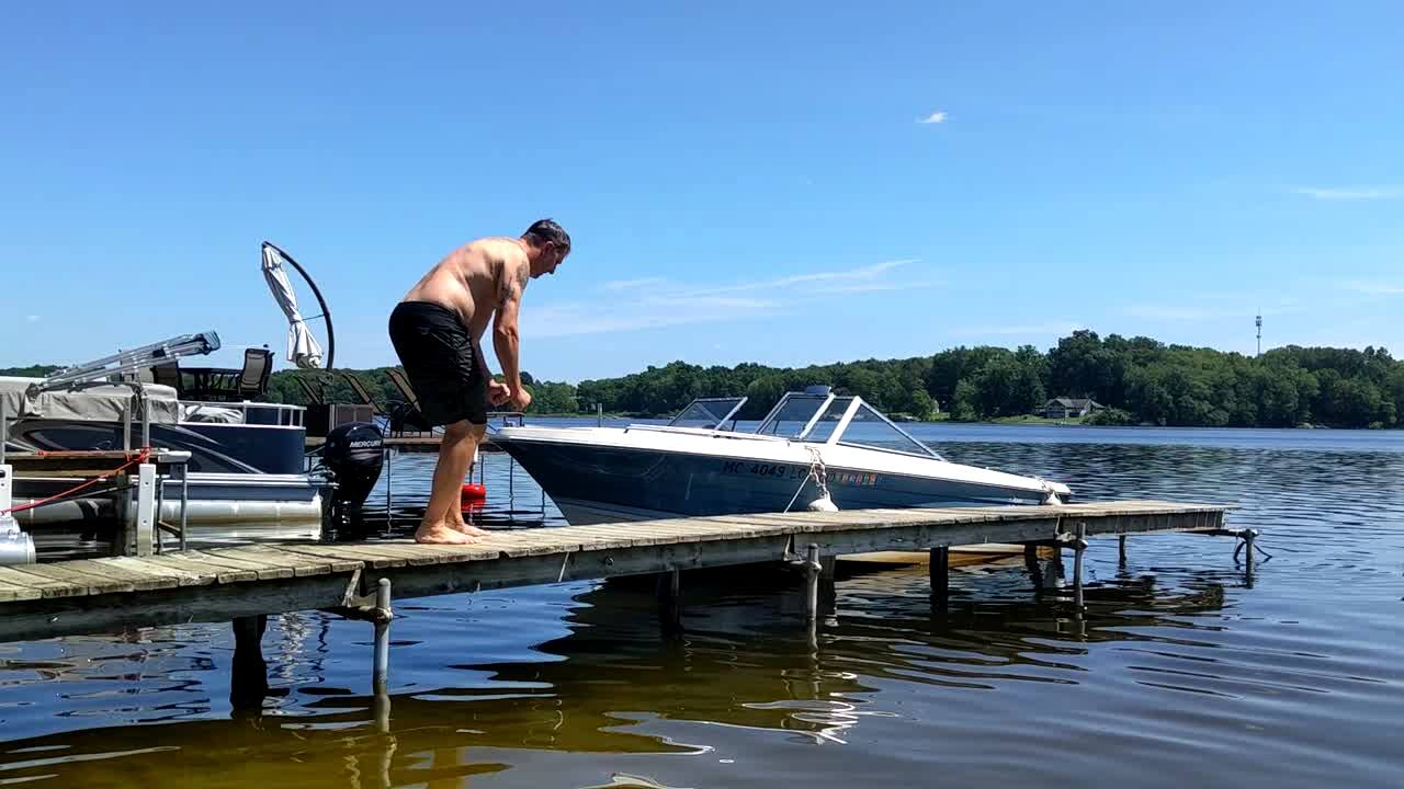 A man jumps off of a dock and falls when he tries to land on a raft.