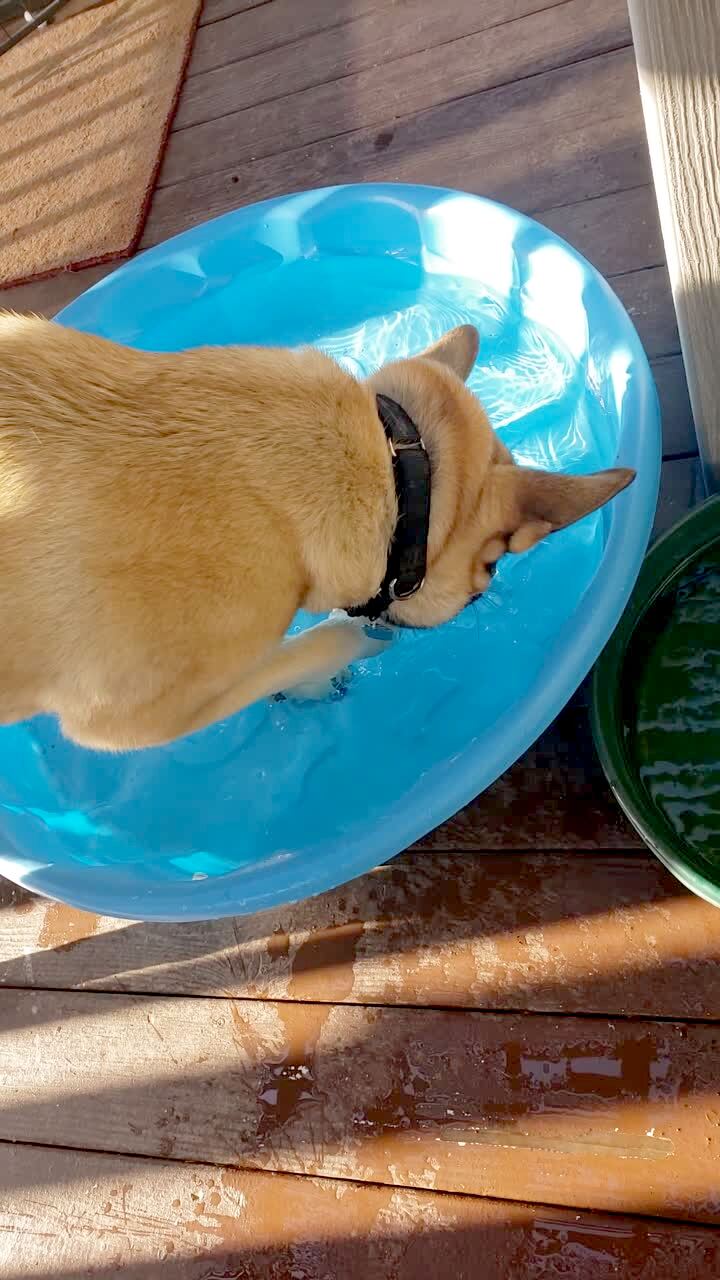 A dog tries to reach plastic dog bones printed onto the bottom of a kiddie pool in a yard.