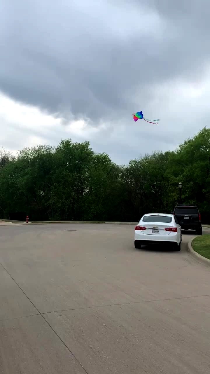 A young girl runs with a kite in a road and crashes into a parked car and falls down.