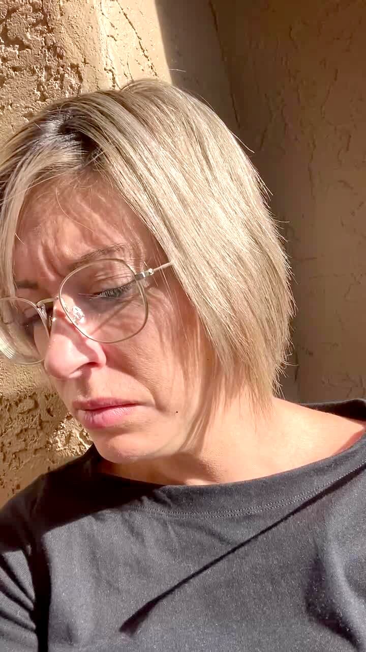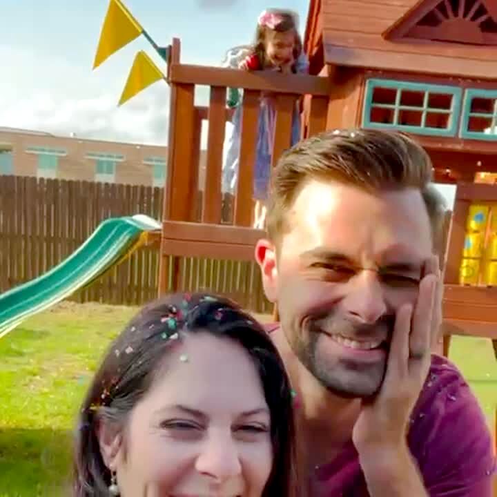A woman records a selfie while she poses with a man in the yard. A young girl stands on a slide in the background and throws an egg and hits the man in the head.