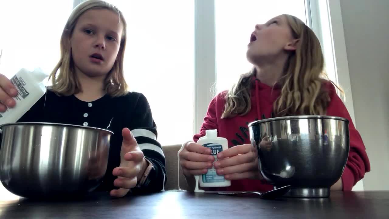 A young girl shoots glue in the air, and it gets in another girl's hair.