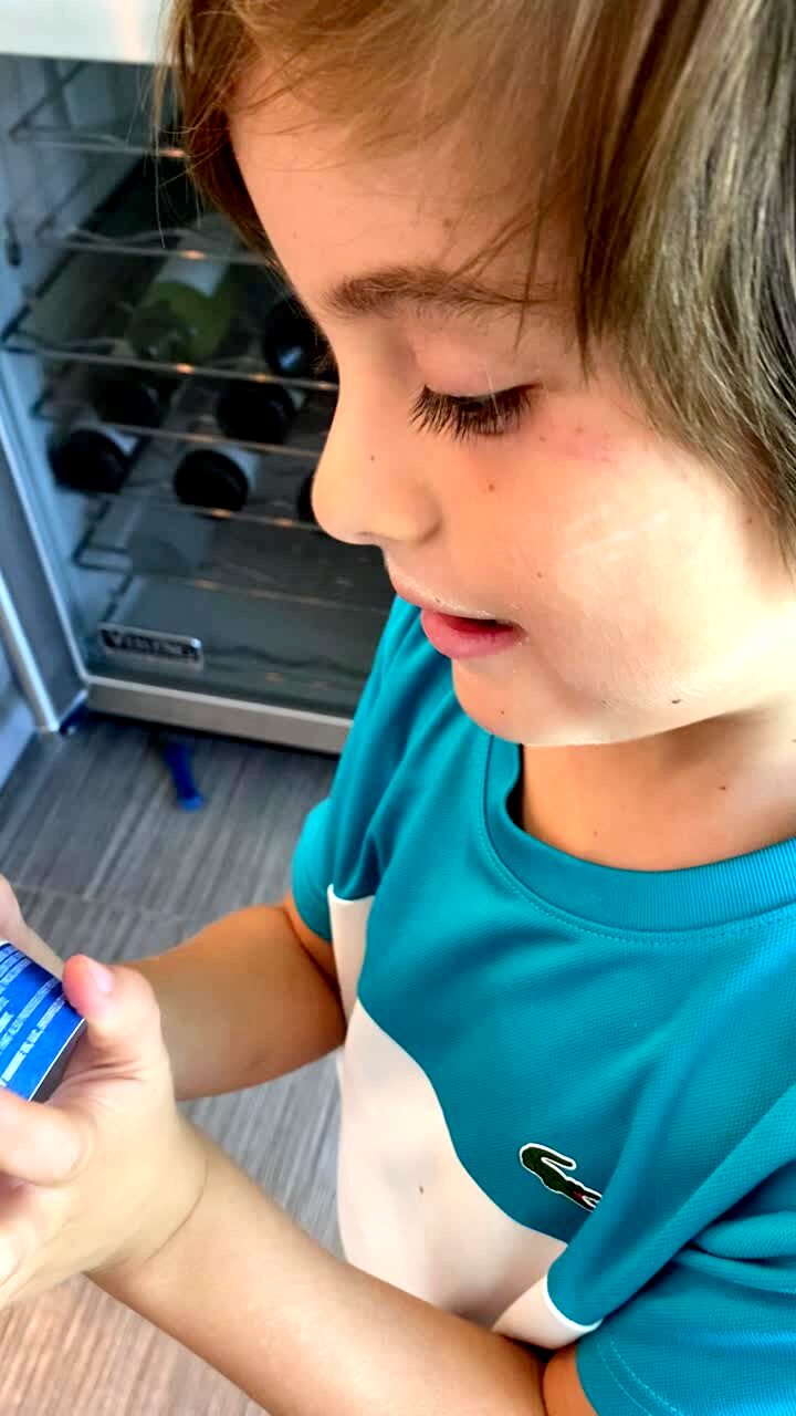A young boy in a kitchen reads a yogurt label and says the amount of cholesterol is "oh my god." The woman with the camera says it's 0 milligrams (0mg).