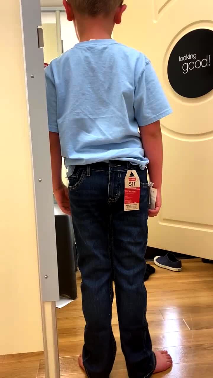 A young boy trying on pants in the dressing room of a store accidentally puts the pants on backwards. He tells his mother "they don't feel very good" while mom laughs and asks him to turn around.