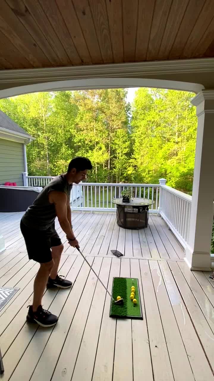 A man on a deck tries to hit golf ball into a yard but the ball hits a table and bounces back and hits him in the face.