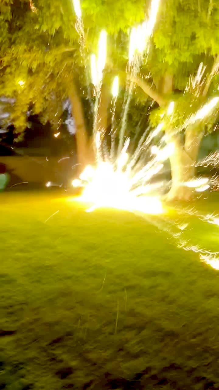 A firework launches in the backyard, but it launches sideways and explodes on the ground. A family of camera screams.