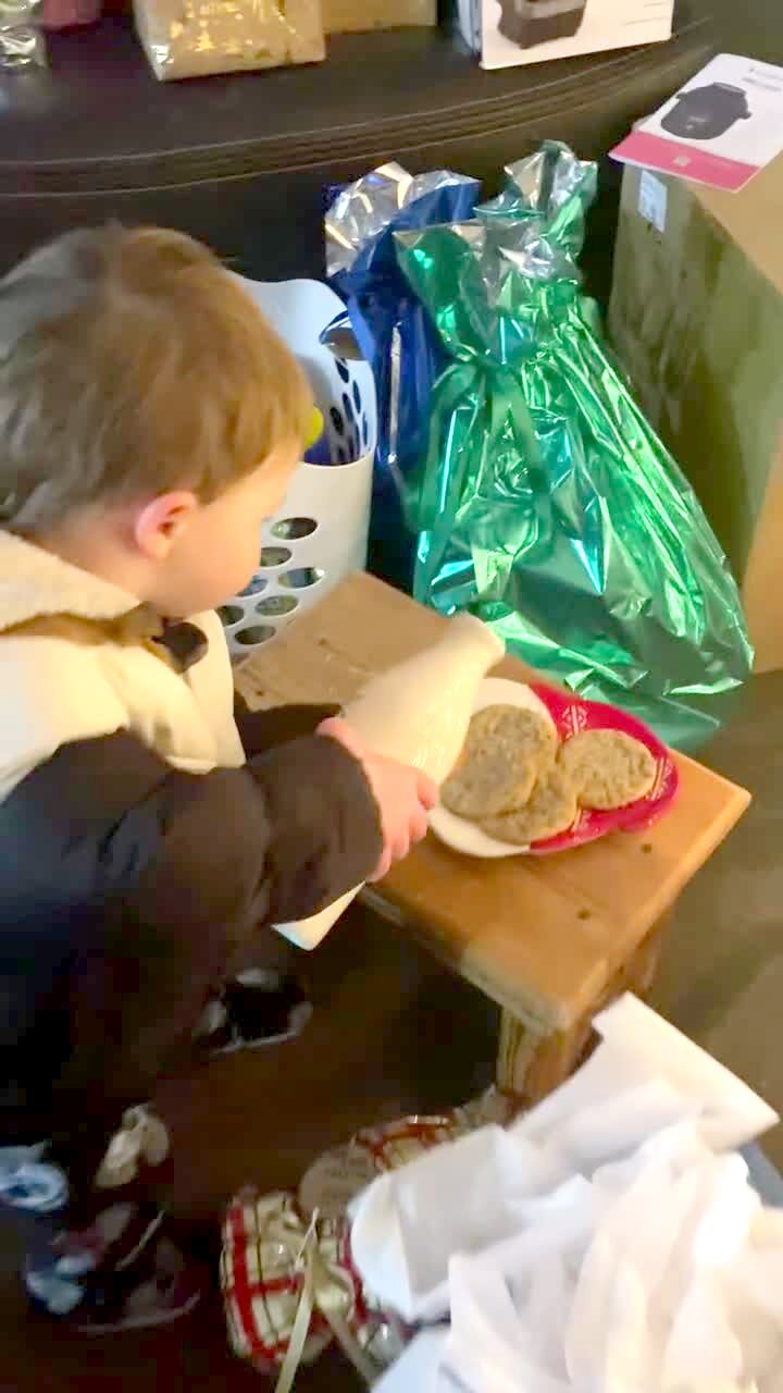 A man helps a young boy carry a plate of cookies to a table next to a Christmas tree for Santa. Then the man gives the boy a bottle of milk to put next to the cookies. The boy takes the lid off the bottle and pours the milk on the cookies.