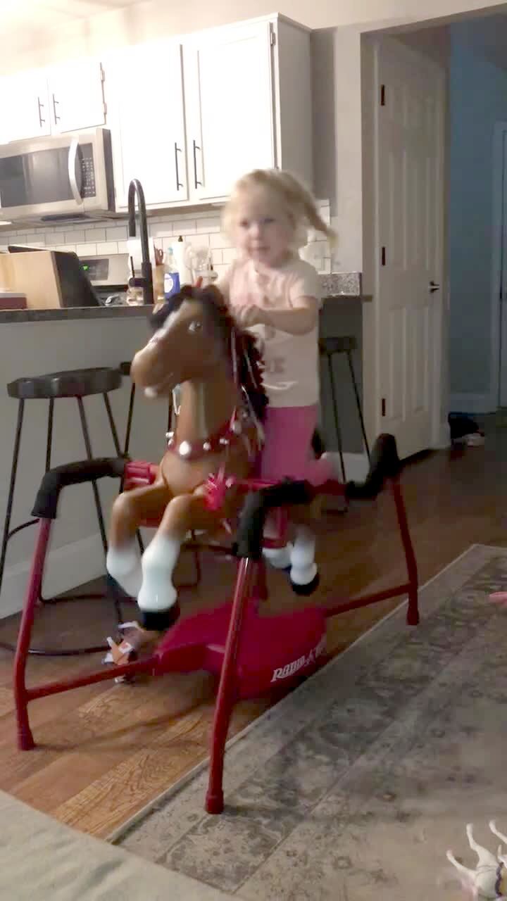 A young girl rides a rocking horse and repeatedly says "I gotta slow down, Poppy slow down," but she does not slow down and eventually she just falls off.