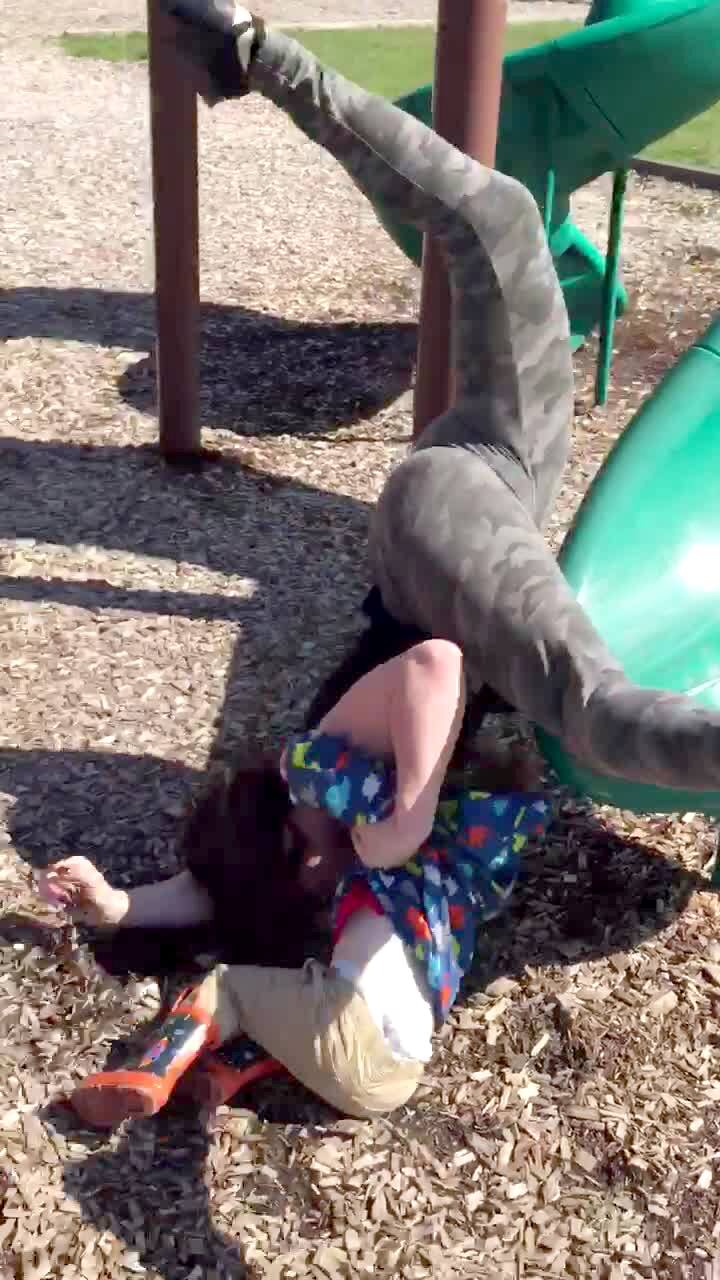 A woman goes down a slide with a young boy at the park, and she lands on top of him at the bottom.