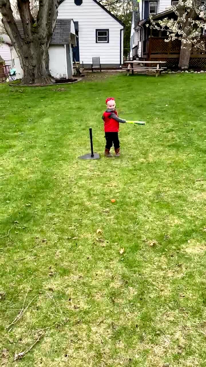 A man plays tee-ball with a young boy and when he tells him to "run home" the boy runs back to his house.