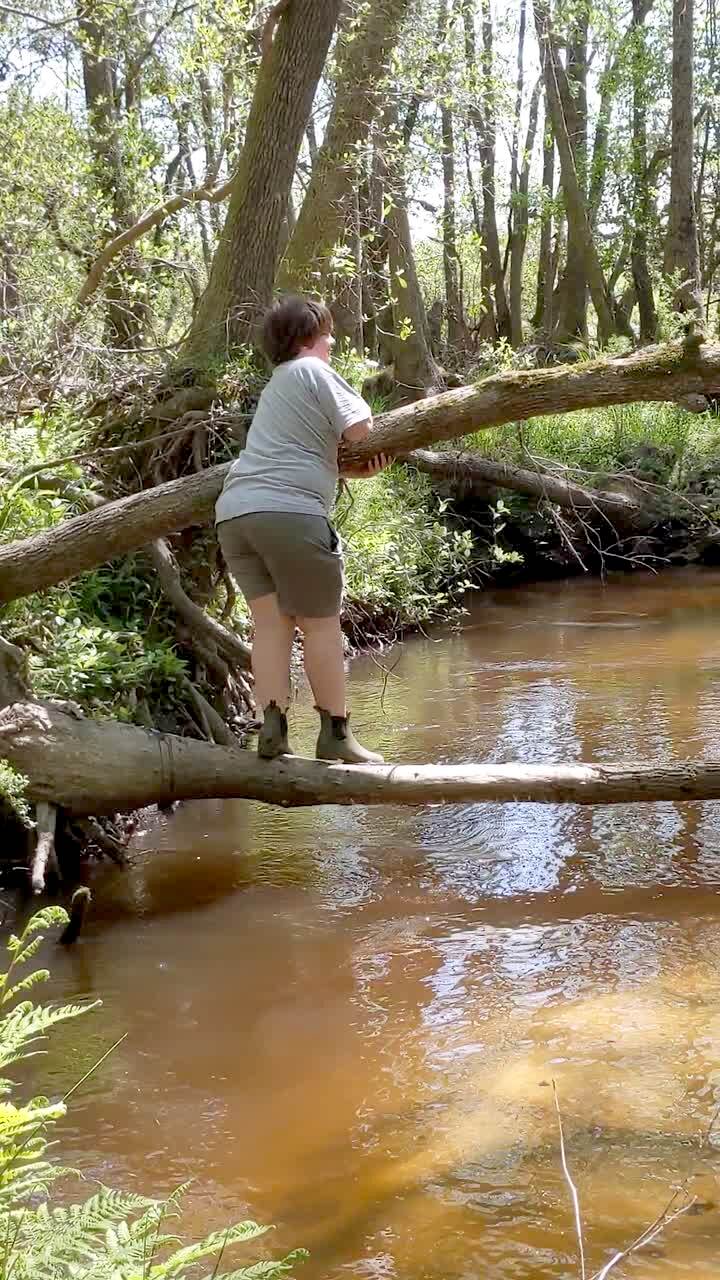 A young boy walks across a creek on a tree branch and it breaks and he falls into the water.