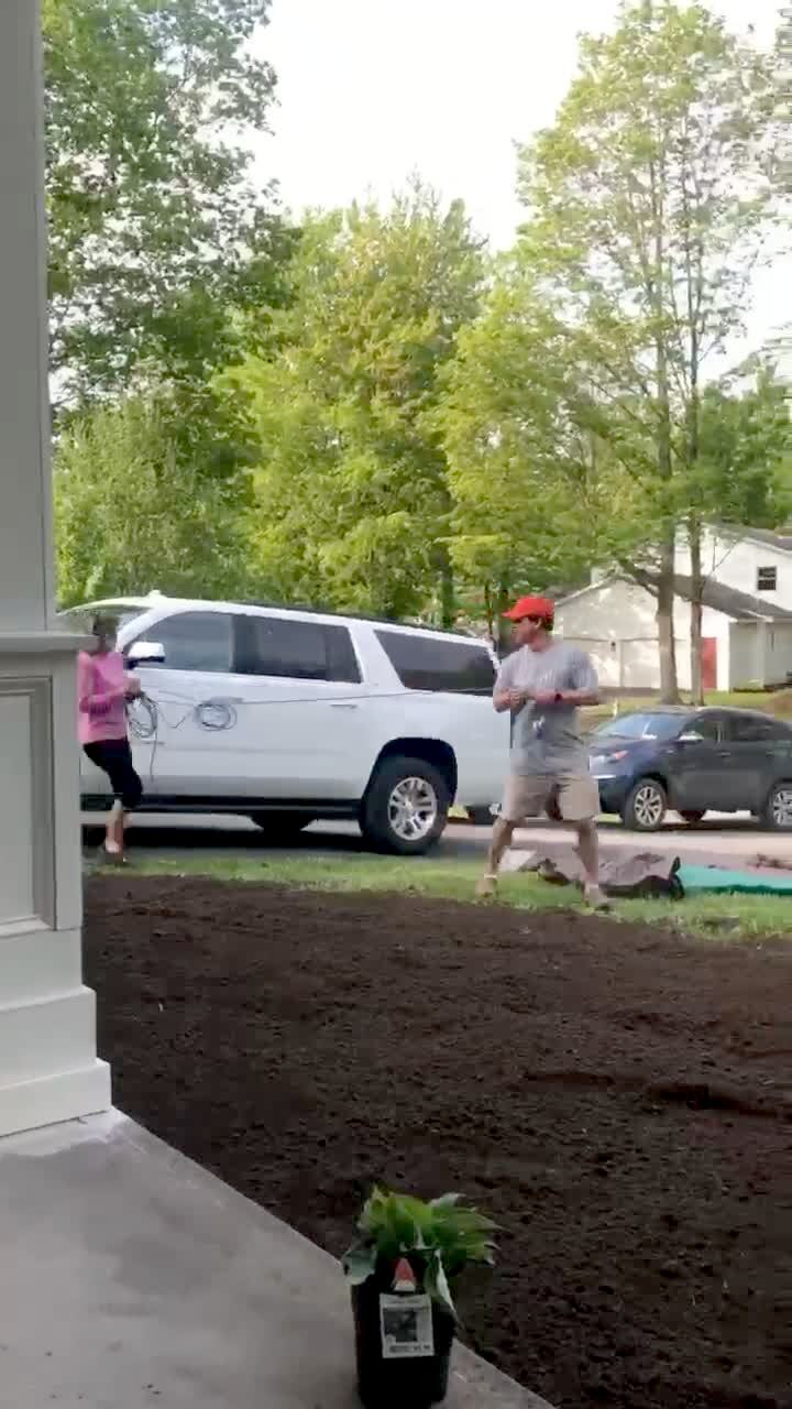 A man and woman unwind a chord in the front yard, and the man falls backwards into a wheel barrow.