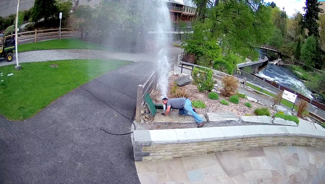 A man fixes a water line and the pressurized water sprays into his face. Security footage.