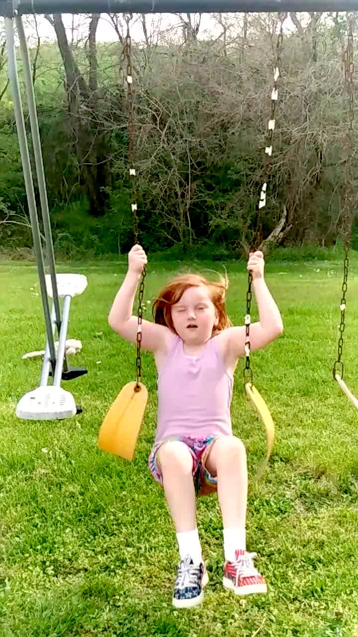 A young girl swings on a swing in the backyard, then falls down when the swing breaks in half. Slow motion.