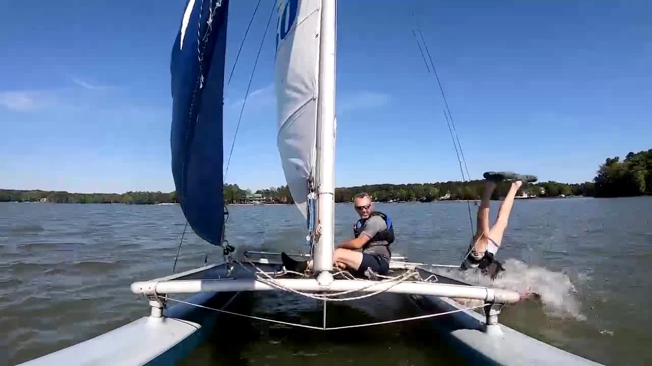 Two men sail on a sailboat on a lake when one man attempts to hang on the boom (he's attached to the sail by a cord/rope). The man falls and gets dragged in the water behind the boat by his lifejacket.