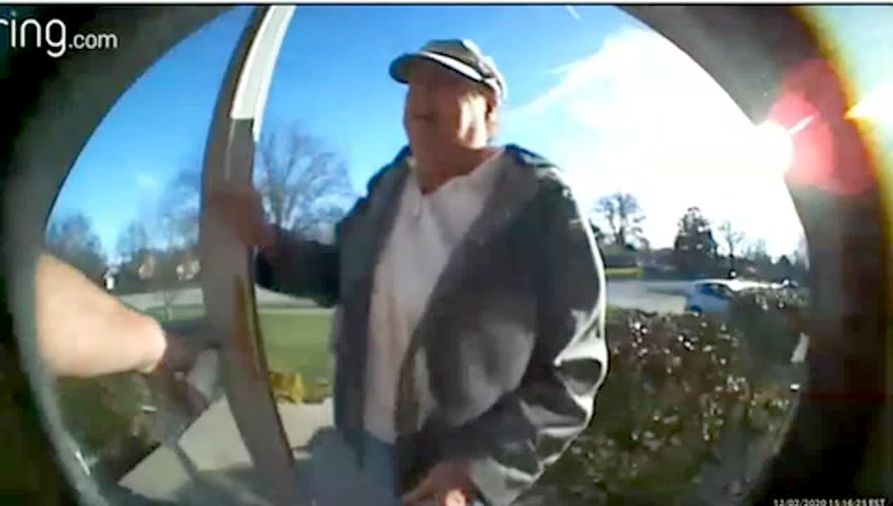 A man accidentally falls on a woman on a front porch and pushes her into a bush. Security footage.