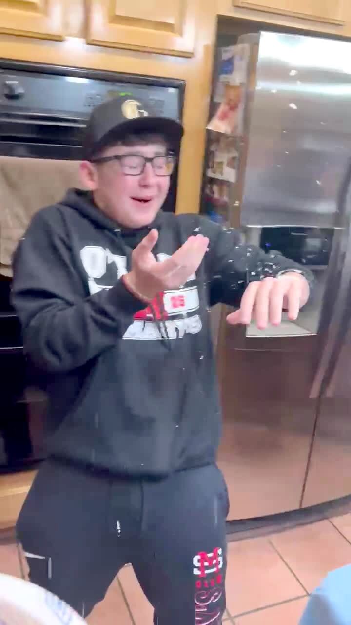 A teen boy attempts the whipped cream challenge, but the cream explodes, and gets in the clothing and hair of all the assembled family members nearby.