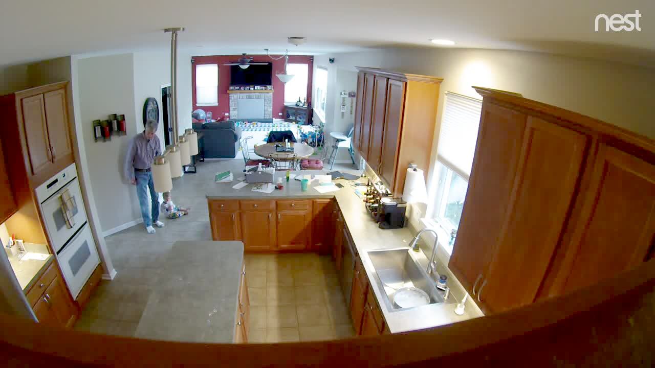 A man kicks a ball to a cat which grabs it and accidentally tackles a baby boy who is sitting on the floor while trying to retrieve it. Security footage.