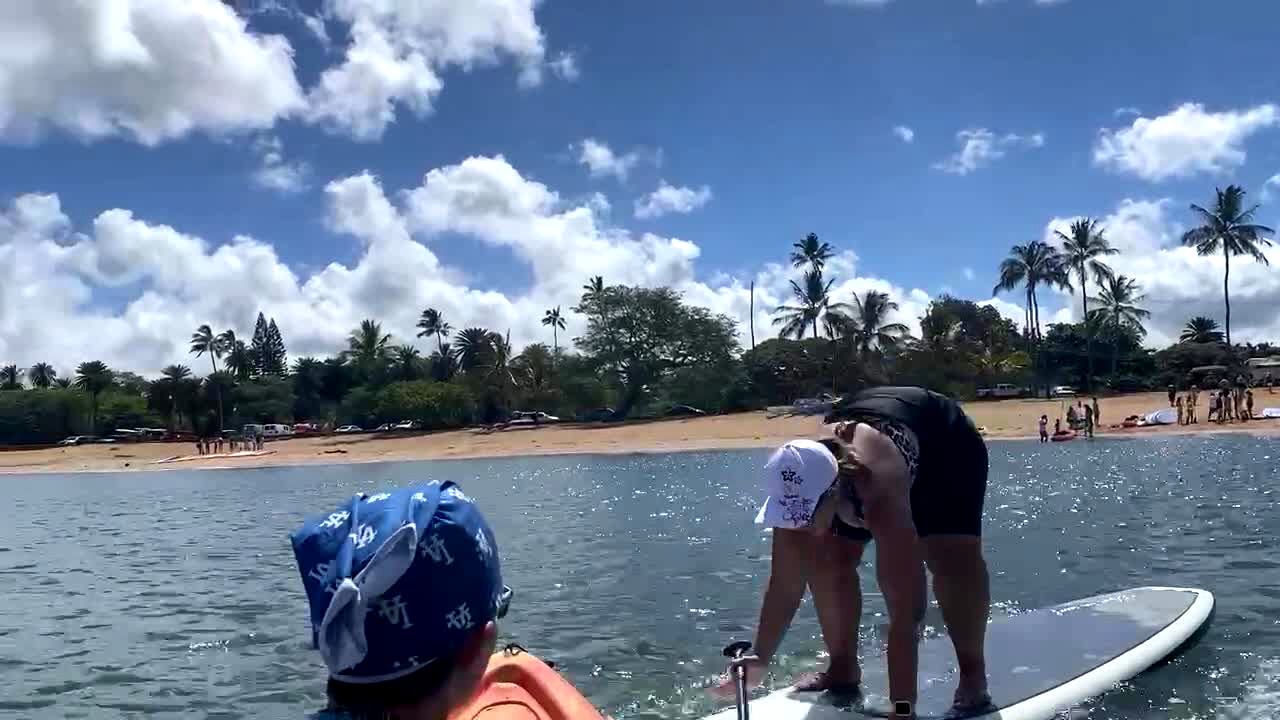 A woman paddle-boards for the first time and falls into the water while her family watches on. The man says "shit" when she falls. Featured talent cleared only (no releases for the people in the distance on the beach).