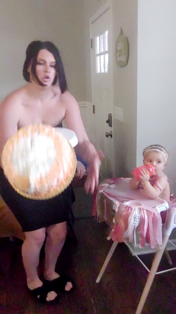 A woman carries a giant birthday cake over to a one year old in a high chair in the living room as guests sing "Happy Birthday." When she gets to the baby, she drops the cake on the floor.