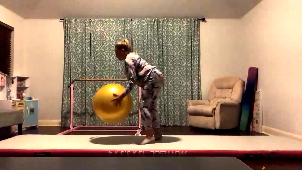 A young girl dances with an exercise ball and tries to land on it only to slam into the ground. Music rights not cleared.