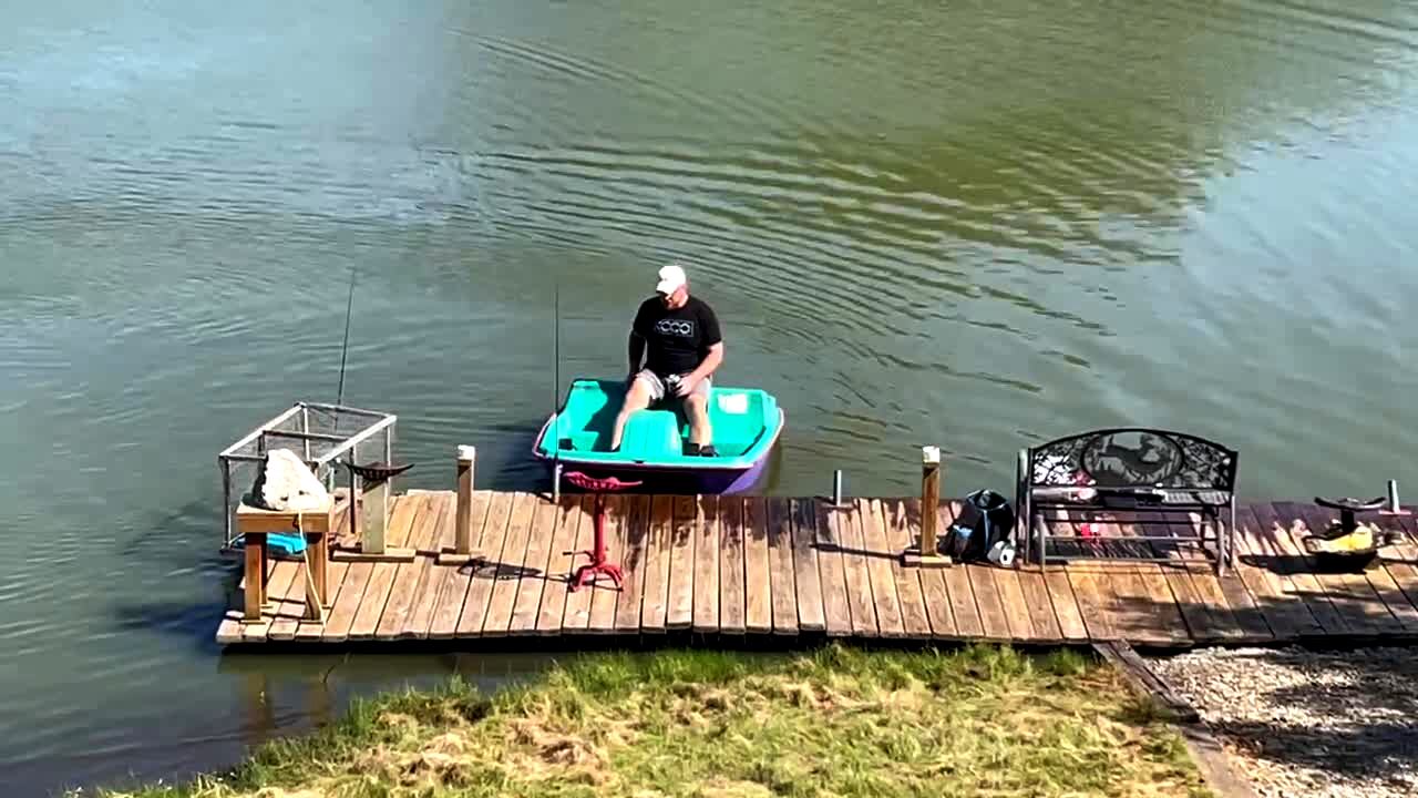 A man tries to get out of a paddle boat onto a dock, but the boat drifts away and he gets stuck between the two. He steps back into the boat, but he falls into the water and the boat tips on top of him.