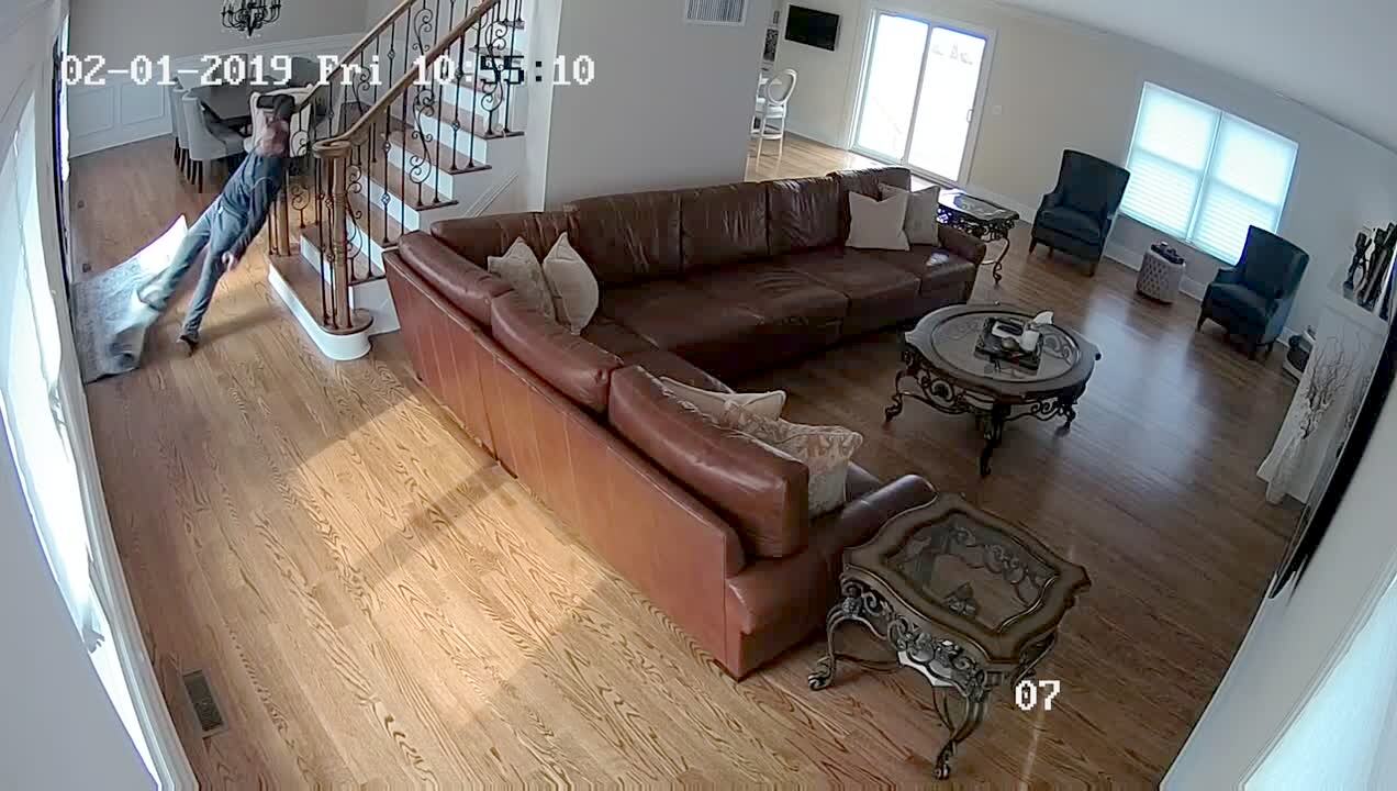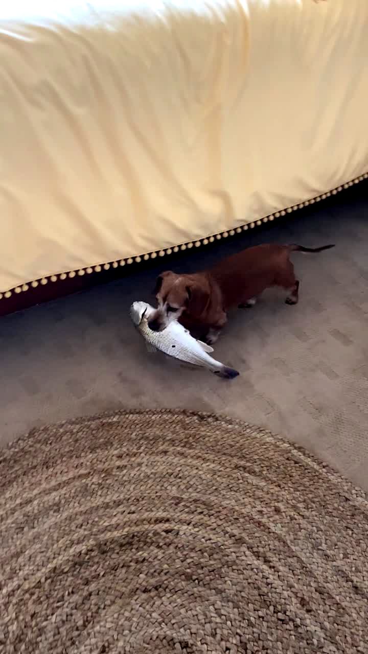 A woman finds her dog with a fish in his mouth in her bedroom. She tries to get him out of the house, but he walks into another room and hides under the bed.