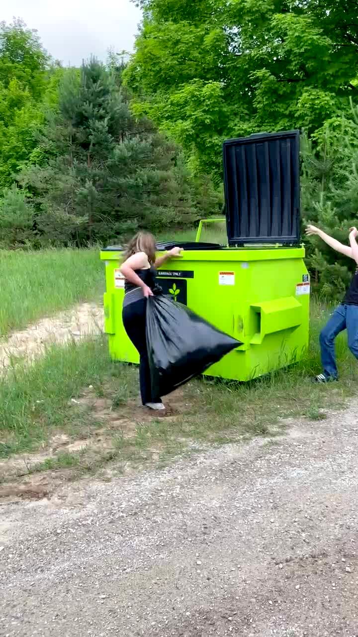 A teen girl tries to throw a large trash bag into a dumpster, but she cannot lift it and the dumpster lid falls on her fingers.