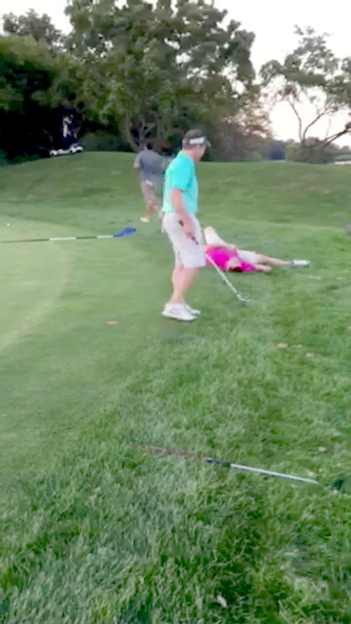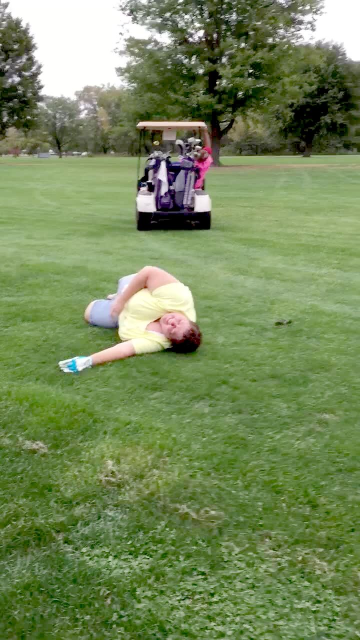 A woman leans out of a moving golf cart to reach her ball on the ground outdoors and falls out.