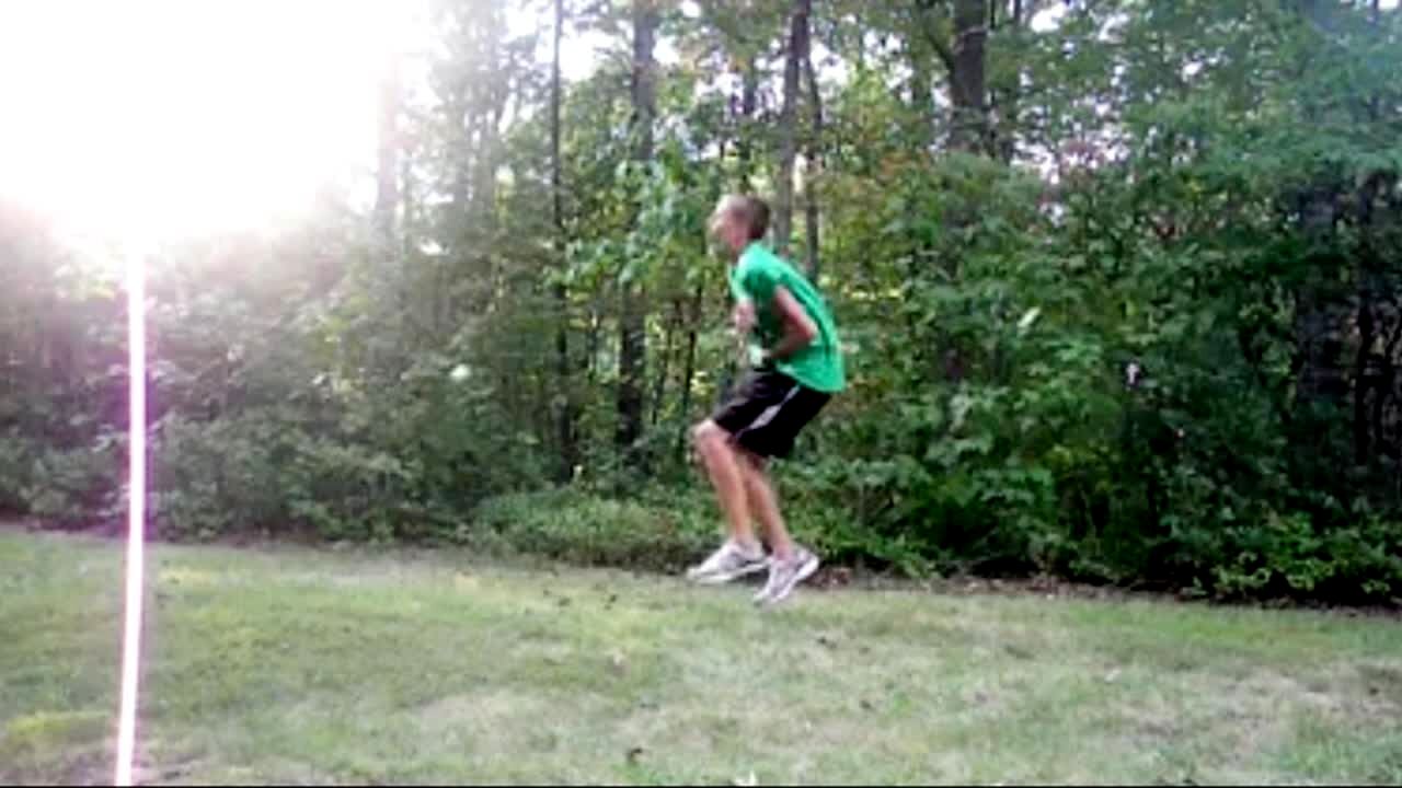 A teenage boy hits a golf ball, it bounces off of something and then hits him in the stomach outdoors.