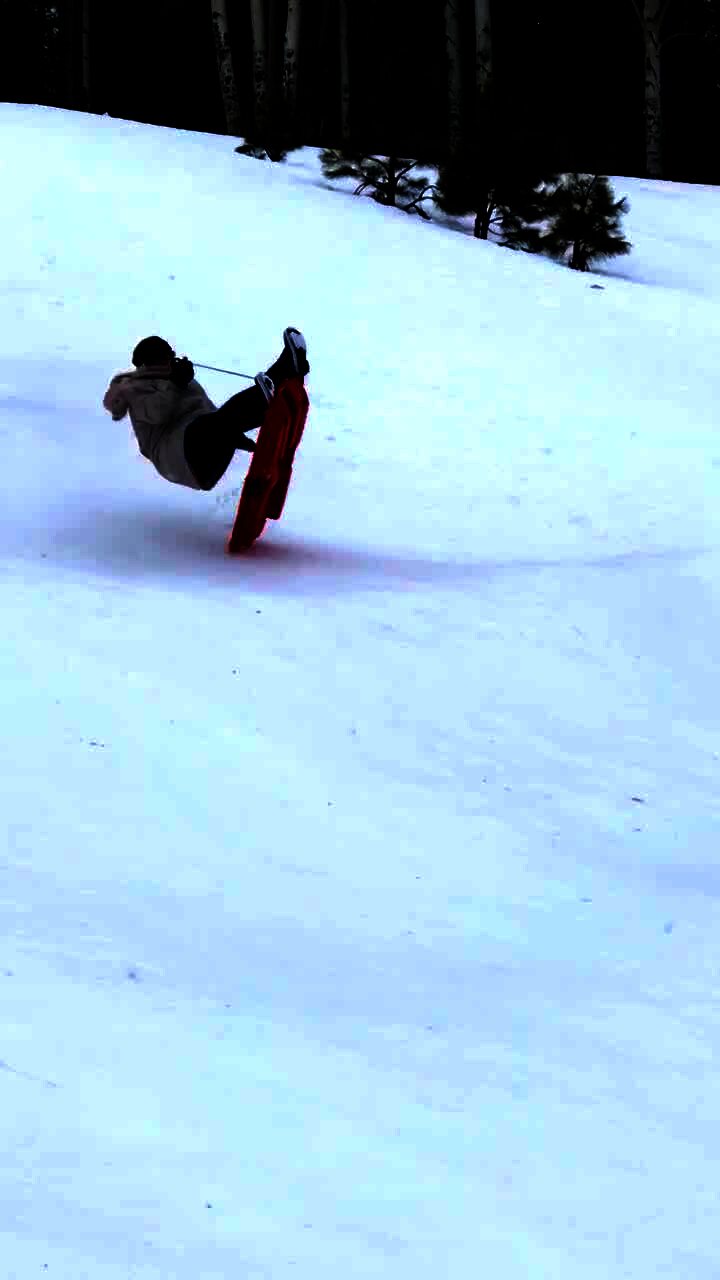 A woman sleds down a snowy hill and hits a jump and she flies in the air and hits her head when she lands.
