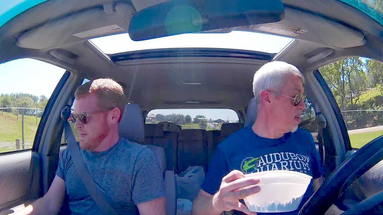 Two men feed llamas from their car in a safari park. One of the llamas stands in front of their car so they can't keep driving. Another llama spits on the men. Emu