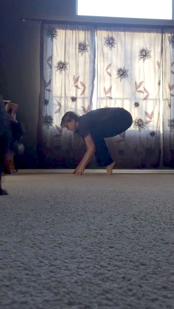 A woman practices a yoga move indoors when her dog walks in front of her and drags its butt along the carpet.