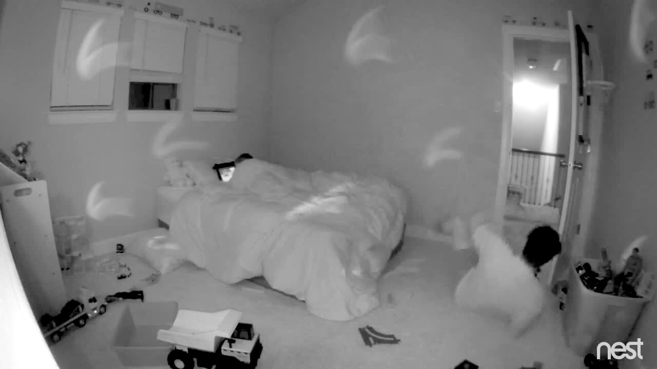 A man stands on a bed and when he steps down, he steps on a toy truck and it rolls out and he falls down.