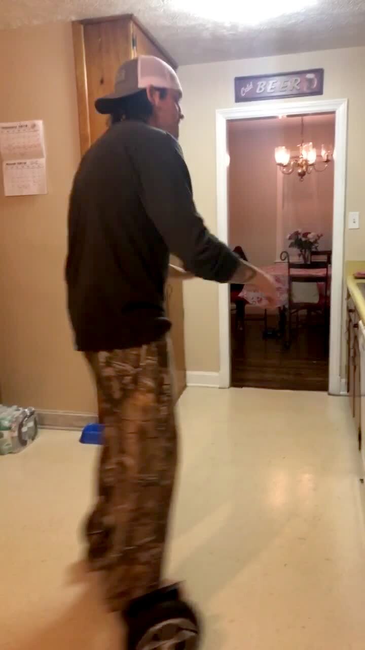 A man falls in the kitchen while he dances to a rap song as he rides a hoverboard while drunk.