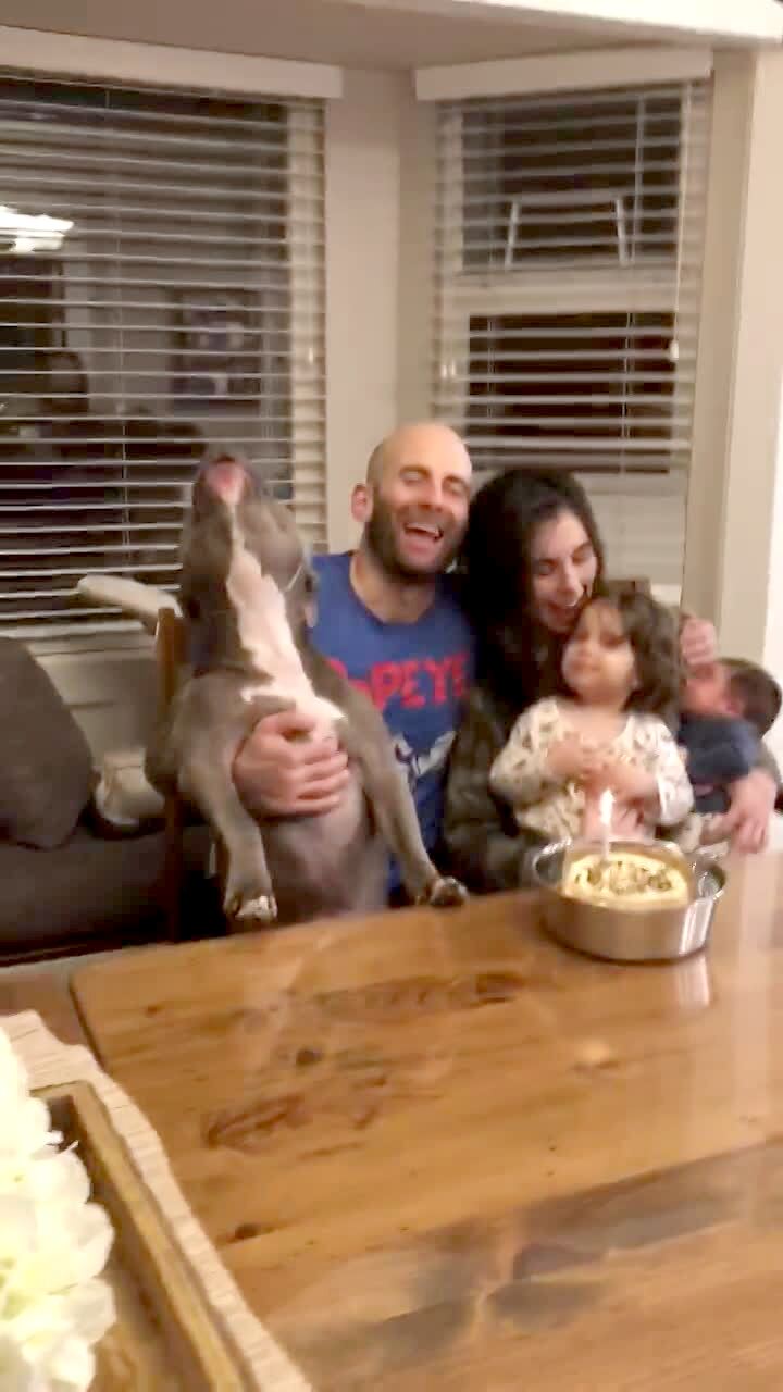 A pitbull dog howls in a man's arms at the dinner table while he and a woman sing happy birthday to him.