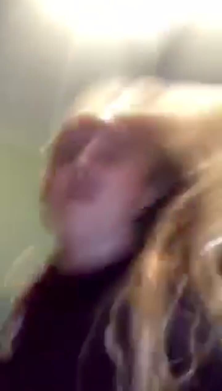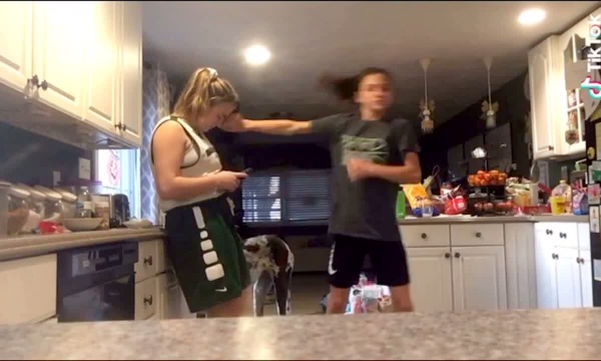 A young girl punches her teen sister in the head as she makes a video in the kitchen.