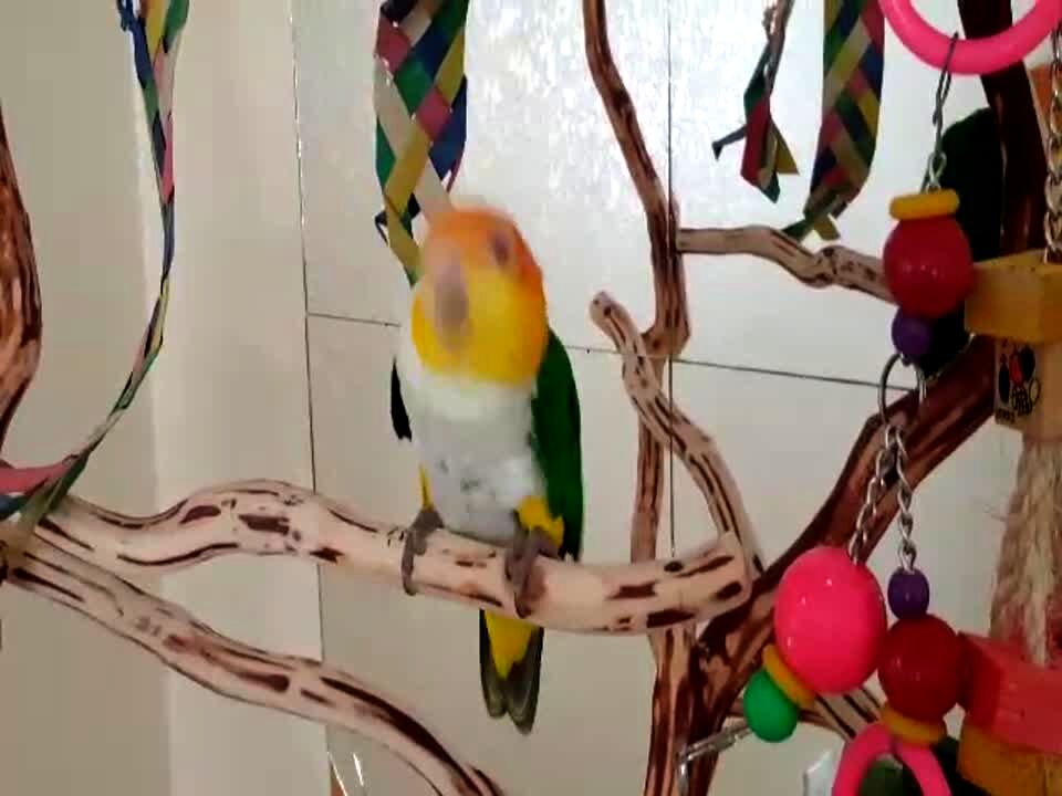 A Parrot bird bobs his head and moves his body up and down to the rhythm of a song while he sits on a branch in his cage.