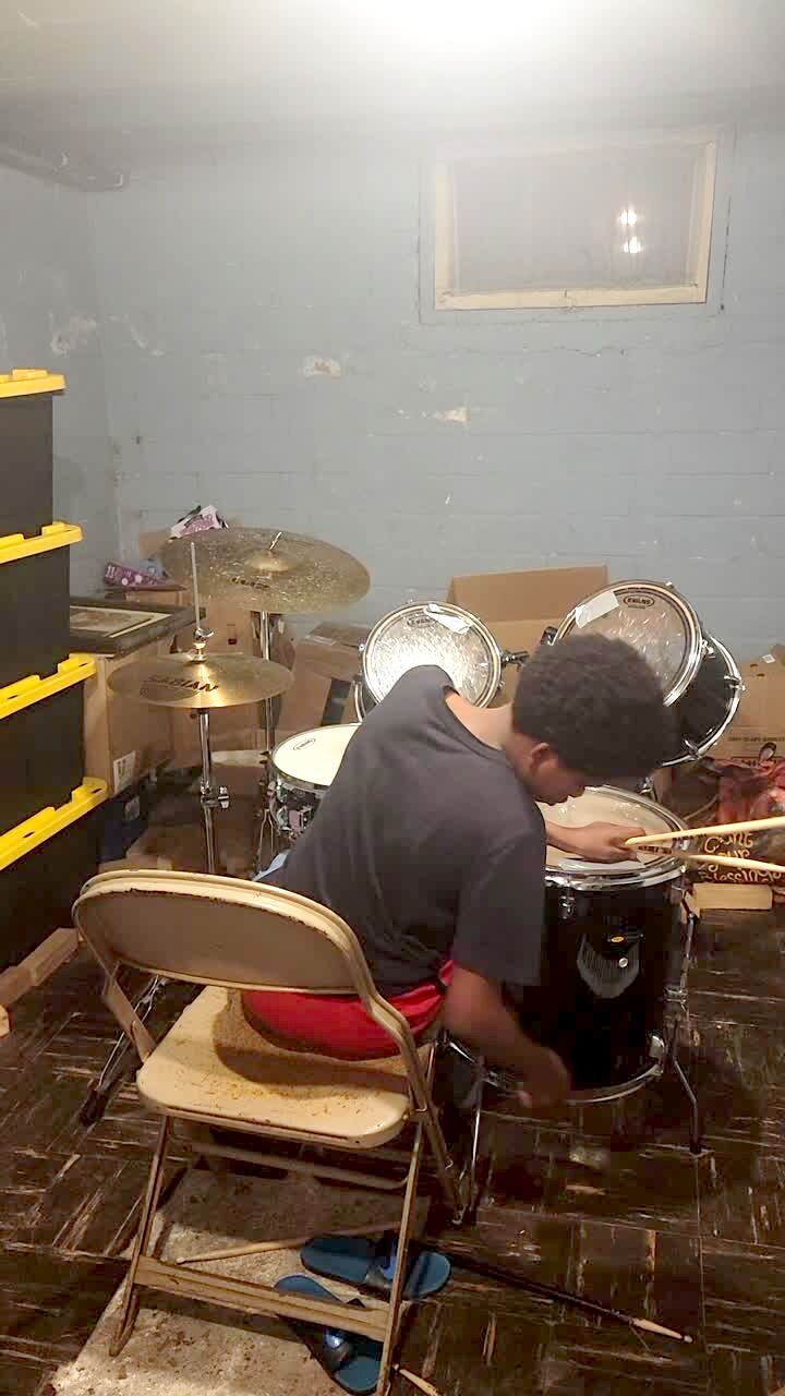 A teen boy plays the drums in a basement. He turns around and sees that a woman films him. The boy screams and drops the drum.