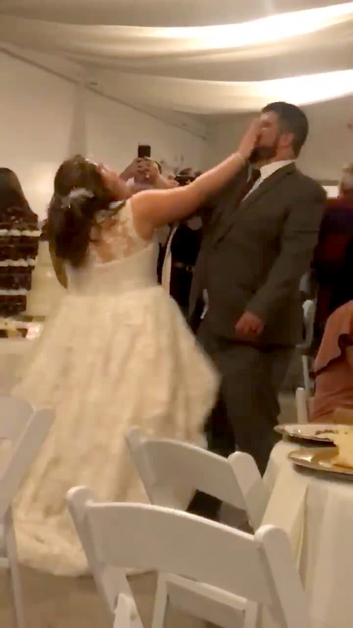 A bride at a wedding reception falls on her butt when she backs away from her husband as he tries to smash a piece of wedding cake in to her face.